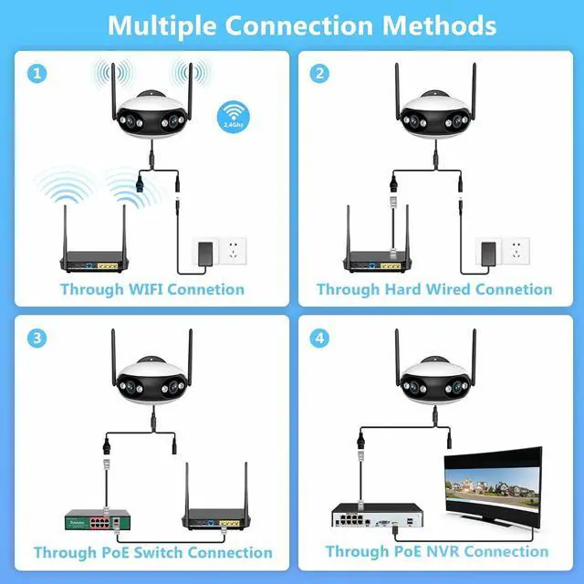 Support Wi-Fi & PoE Connection, SD card & NVR StorageTwo connective ways for choice. Wi-Fi (*Only 2.4GHz Wi-Fi) and PoE. You dont need to connect a network cable in wireless connection. Or you can transmit both power and surveillance images through only one ethernet cable. Convenient for indoor and outdoor use. It supports SD card & NVR Storage. The built-in SD card slot supports micro SD card (not included) up to 128G. Recording 24*7 videos and easily playback on phone app and PC.