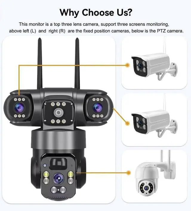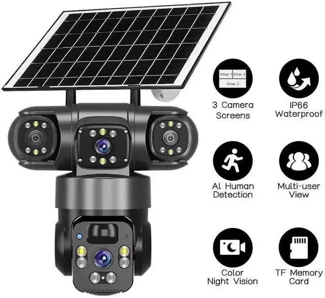 Triple-Lens 12MP Ultra HD Panoramic Monitoring with Zero Blind SpotsThis solar powered security camera outdoor Equipped with three 4MP lenses, it simultaneously captures three 1080P HD images. The 355° horizontal + 90° vertical PTZ (pan-tilt-zoom) allows flexible rotation, combined with digital zoom to cover three key areas at once: courtyard, driveway, and fence. Details like license plates and facial features are displayed clearly, tripling security efficiency in complex scenarios.