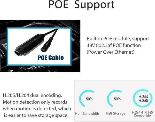 Support 48V 802.3af POE Function Support POE function(Power Over Ethernet), reduce the trouble of cable arrangement. And it also have auxiliary power connector, can be powered by a conventional 12V 2A power supply and used as a Non-POE IP camera.(NoticePower not included in this package,This camera not wireless/not Wi Fi )