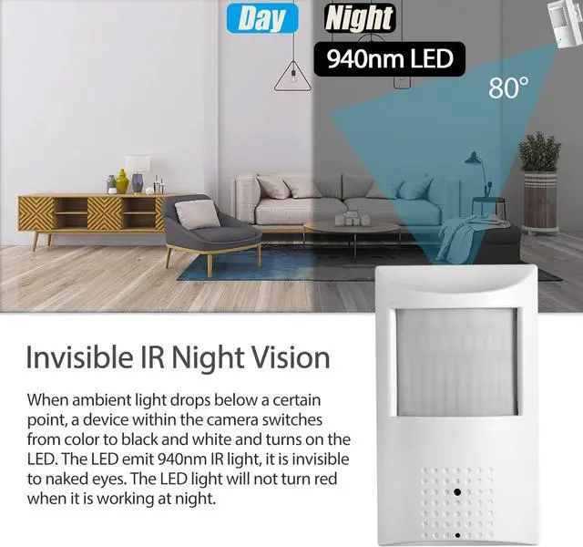 940nm Invisible LED and Built-in Microphone This camera has a 940nm LED board installed, invisible to the naked eye. The LED light will not turn red when working at night. When the ambient light drops below a certain point, the device inside the camera switches from color to black and white and turns on the LEDs. This camcorder supports the recording function, and the sound around the camera is also recorded when recording video.