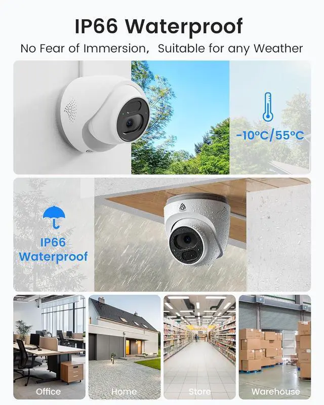Weatherproof & Durable IP66 Rated for Indoor/Outdoor UseBuilt tough with metal housing and IP66 waterproof rating. Withstands rain, snow, and heat. The adjustable mount offers flexible positioning (manual adjustment onlyno remote PTZ).