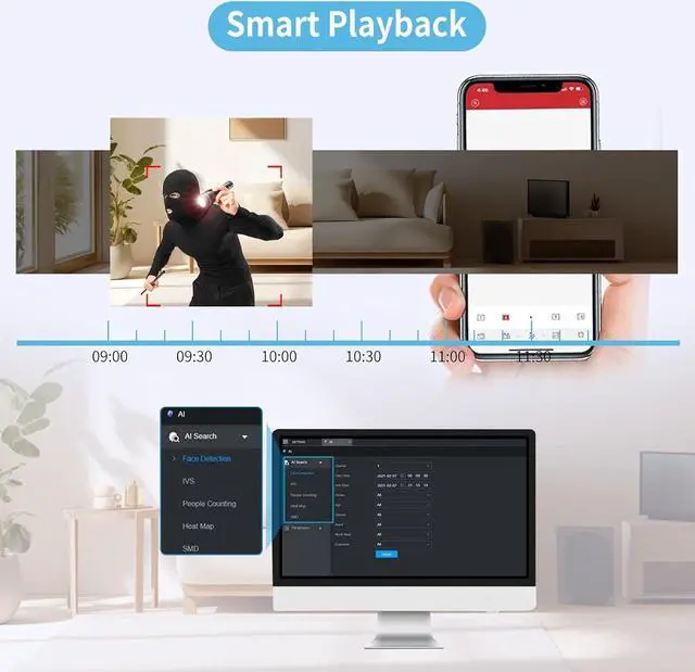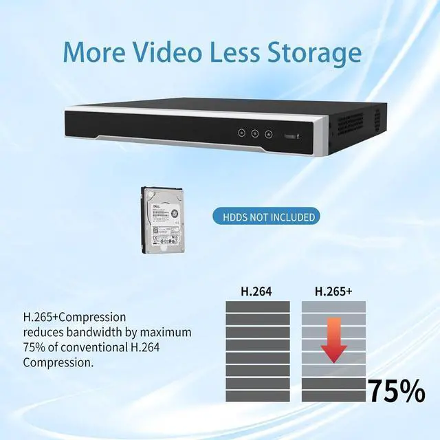 Smart H.265+ technology reduces storage usage by 75% compared to H.264, saving you hard drive space and costs. The NVR efficiently handles 1-channel 8MP or 5-channel 1080p decoding, ensuring smooth playback of high-quality footage