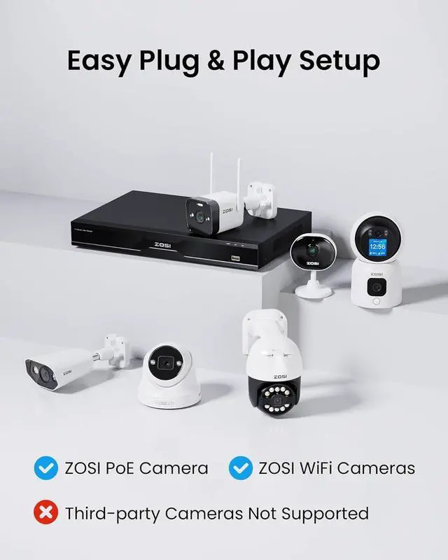 Smart Integrated with ZOSI Cameras: Perfect integration with ZOSI IP cameras, support face/person/vehicle detection and recording, and build intelligent security systems. More ZOSI cameras with automatic tracking, two-way calls, motion-triggered spotlights, etc. can be added to achieve cutting-edge home or business security protection.