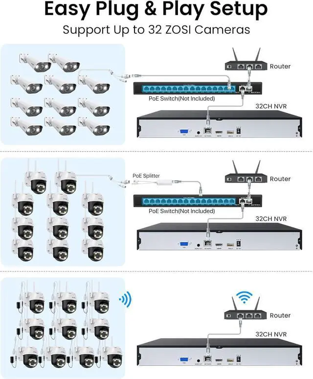 High-performance 32CH Expandable System: You can easily expand the 32CH security camera system to support 32 ZOSI IP cameras connected to the PoE switch, and then connected to this NVR for integrated management. Suitable for villa, business and factory. Note: This 32CH NVR only compatible with ZOSI PoE cameras or WiFi cameras. It is particularly noted that the ZOSI WiFi camera should set up via the APP, connected to the same WiFi network as the NVR.