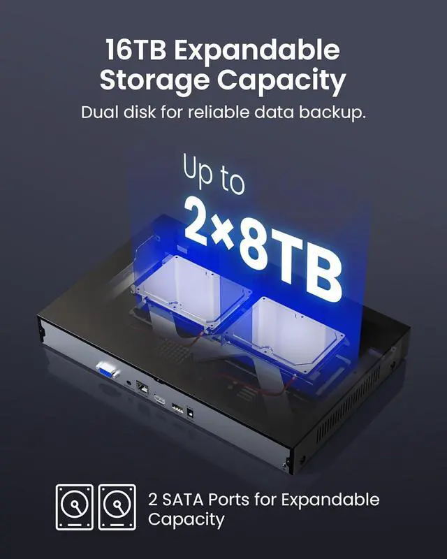 Commercial-Grade Storage: The NVR is equipped with 2 HDD bays, each of which supports up to 8TB of hard drives, for a total of 16TB (hard drive Not Included), meeting commercial-grade storage needs. Designed for enterprises, it provides stable and reliable data storage solutions.