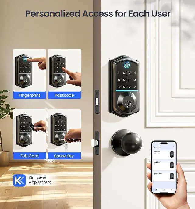 7-in-1 Smart Access: Unlock via fingerprint (Swedish FPC tech), App, authorized access, RFID card, code, code sharing, or mechanical key for versatile use; Includes 5 locking methods: Auto lock+ Fingerprint + Any Key + App + Mechanical Key