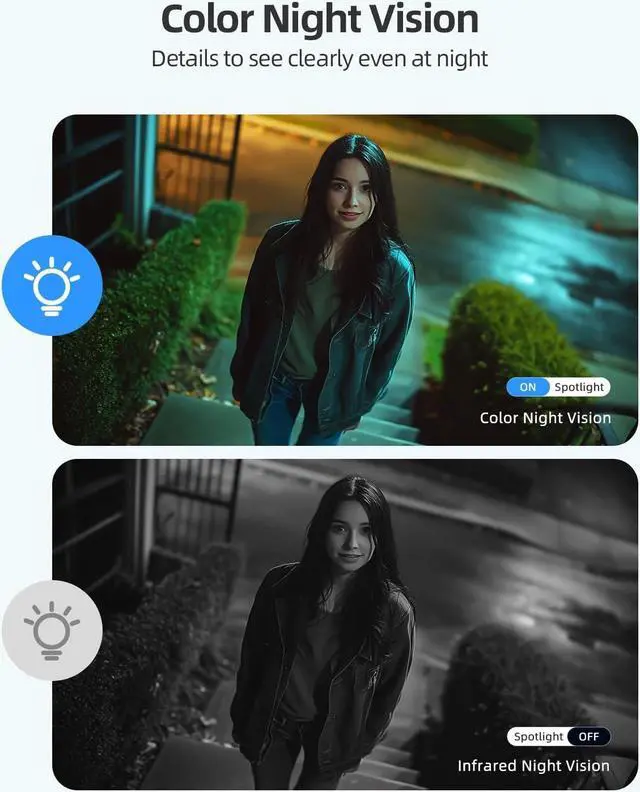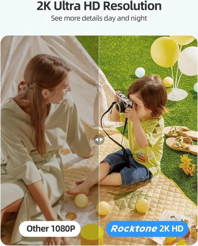 2K QHD Resolution & Full Color Night Vision - Unlike typical 1080p cameras, the Rocktone outdoor wireless camera offers 2K UHD resolution, providing double the clarity. It features a wide-angle field of view and boasts two night vision modes:full-color and infrared, allowing for a maximum monitoring range of 33 feet. This ensures that you capture high-quality videos and images even in low-light conditions