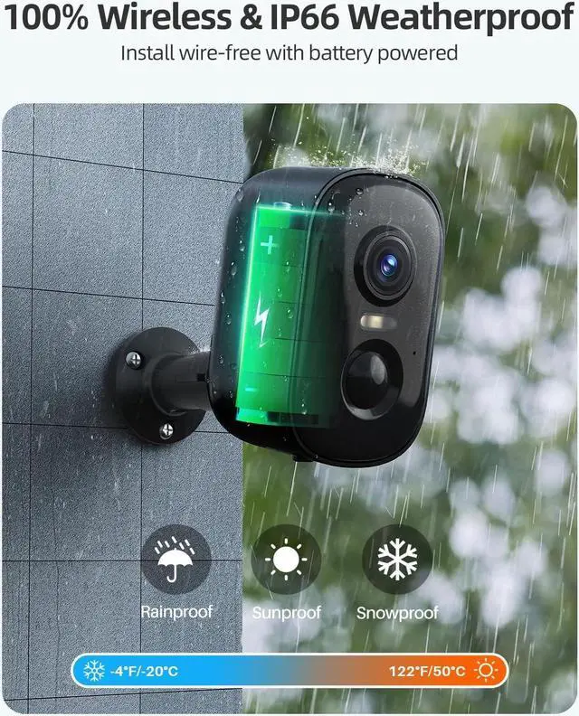 100% Wireless, Rechargeable, Weatherproof - This outdoor security camera boasts a high-capacity rechargeable battery and operates wirelessly for hassle-free installation. It comes with a mounting bracket and screws, eliminating the need for complex wiring and additional power sockets. A single charge provides 1 to 5 months of operation. With an IP66 waterproof rating, this camera is highly weather-resistant and performs reliably in various adverse conditions