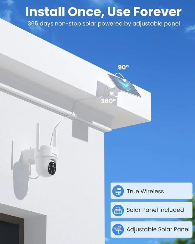 5MP 3K Ultra HD & Color Night VisionVIZUUY solar camera security outdoor comes with 5MP (2560*1920)resolutions, provides more clear video than 2MP/3MP outdoor wireless camera. Upgraded 4pcs bright spotlights provide you with color night vision, the visible distance is up to 50ft/15m. Get picture-perfect live video with this solar powered security camera no matter during the day or night