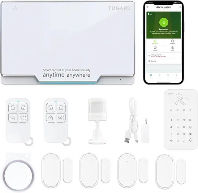 11 PIECES HOME ALARM & ANTI-THEFT KITS: WiFi Control Panelx1, Keypad for the Home Security Alarm Systemx1, Window & Door Sensorx4, Wireless PIR Motion Sensorx1, Remote Controlx2, Wired Siren x1, USB Cable x1.The real time main interface status bar are displayed, and the host status is very clear. It supports multilingual menu, voice operation and SMS alert. NO Monthly Fees.