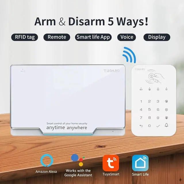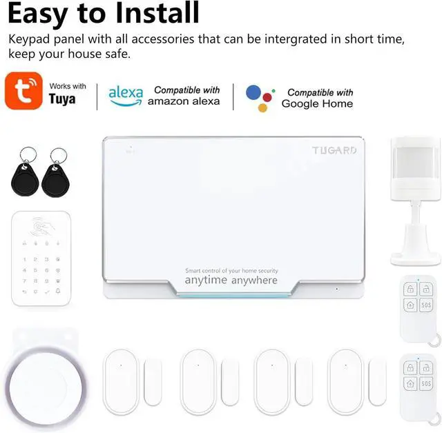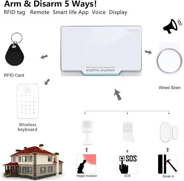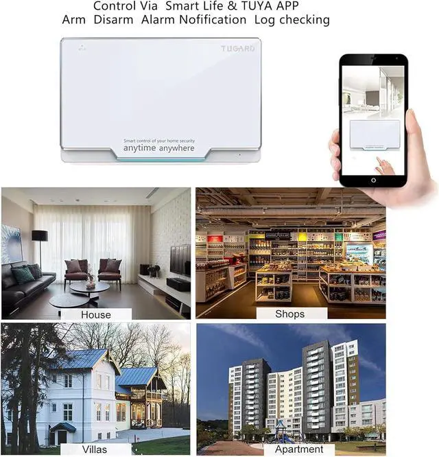 PUSH NOTIFICATION VIA TUYA/SMART LIFE APP: Your cellphone will receive instant notifications once the home/house security alarm system is triggered. And you can set alarm modes, customized alarm system accessory name, operate all the accessories by Tuya or Smart Life APP. Timed arming and disarming function. Support SMS of remote arming and disarming and parameter setting, voice channel support arming and disarming.