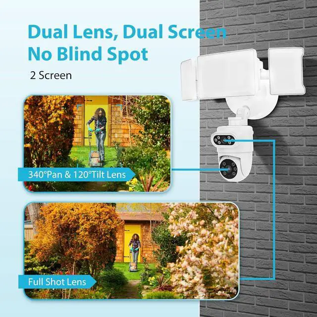 Panoramic 360° Coverage: Enjoy complete home security with a wide 340° horizontal and 120° vertical rotating base camera, plus a 180° pannable secondary camera. Our "dual-lens" flood light camera never misses a thing!