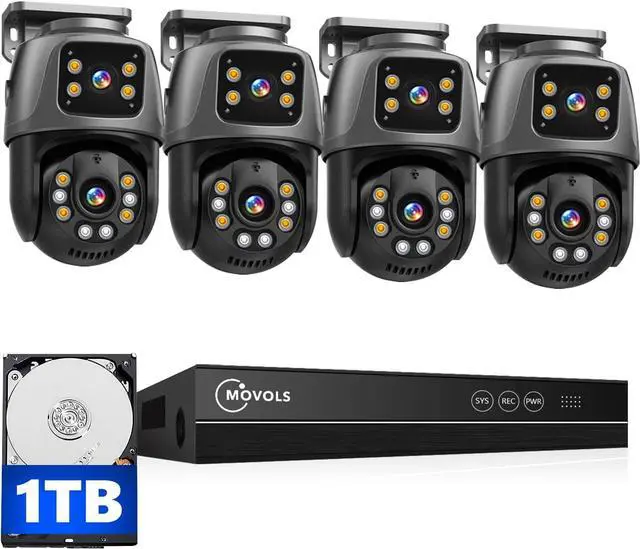 Dual Lens Security Camera with 1TB HDDMovols outdoor PoE security camera system with dual 3.6mm lenses: bullet camera and dome camera provide 360° angle coverage and truly dead-angle free 2-screen UHD images. Built in 1TB HDD gives you a long video retention time(maximum supports 10TB HDD),24/7 recording security camera with non-stop surveillance by this wired security camera system. the Video files can be stored up to 60 days. All video data are encrypted and saved locally, no monthly fees.