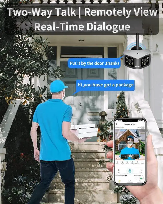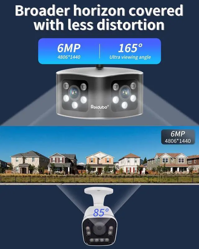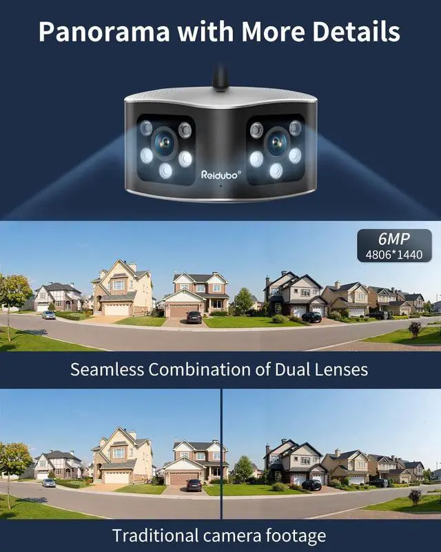 6MP(4608×1440Dual Lens & Ultra Wide FoVReidubo 4K Dual-lens WiFi Security cameras equipped with two lenses can seamlessly combine two images into panorama, broader horizon covered and less distortion, reducing surveillance blind spots. One serves as two. Save your money and make you feel safe. You can remote the security camera to monitor all-round without blind spots. It's a great choice to protect the safety of your property and family.