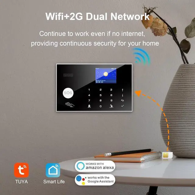 2.4GHZ WiFi + GSM Dual Network Mode-- TUGARD wifi door alarm system utilizes Wi-Fi wireless 2.4G (Not support 5G Wifi) and GSM network technology. Support for Wi-Fi APP home alarm push network alarm, SMS, voice monitoring, main network and other multi-channel alarm methods to ensure stable and reliable alarm performance. 100 wireless zones, 10 remote controls, and 10 RF cards can be randomly added.