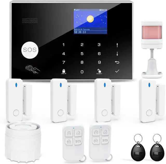 Wirless Security System-- A smart way to protect your house with our smart home alarm system wireless. The smart wifi house alarm system 11-piece kit includes: 1 wifi alarm base station, 4 windows & door sensors, 1 wired siren, 1 motion sensors, 2 remote controls and 2 RFID card. Arm and disarm your alarm system with keypad and remote in seconds or directly from your phone via the Tuya/Smart Life App. No contracts and No subscription fee.