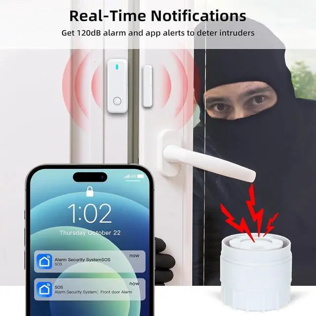 Real-time Alerts-- Stay informed and receive real-time alerts directly to your smartphone through the app, keeping you updated on any suspicious activity. Scare off unwelcome guests with an 120db alarm when a sensor is triggered and get notified with the Tuya app.