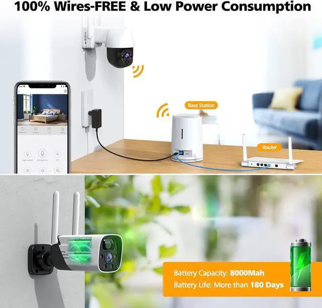 BATTERY POWERED&100% WIRE-FREE: This security system with 8000mA rechargeable battery guarantees each camera's eternal power. If 10-15 triggers per day, can last 180 days on a single charge with our low power consumption technology. You can install the camera anywhere you want as it doesn't need any wires! (NOTE: Wireless means video cable is not required for camera's working, but the base station still NEED connect to power outlet and router with the provided power supply and network cable)