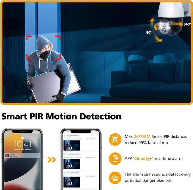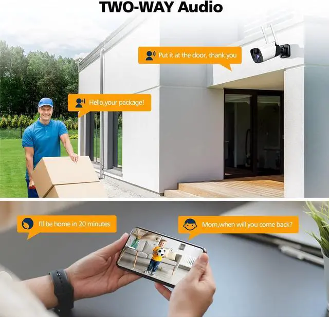 SMART PIR MOTION & 2-WAY AUDIO: Equipped with 120° angle and 26ft distance's sensitive PIR motion sensor, this wireless security camera system sends alerts to your phone in real time when motion is detected and enters to recording state at once. With built-in microphone and speaker, our wireless home security camera can realize two way audio, even on the other side of the globe, you can also see, hear and talk clearly to people with live view in real-time through our APP "CloudEye".
