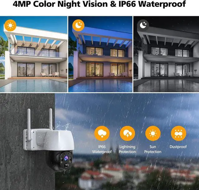 4MP FULL HD & COLOR NIGHT VISION: With 4MP resolution, this wireless outdoor security camera system can provide super clear and sharp images, help you protect and monitor your property. The monitoring screen on APP support 5X zoom, easy to check every detail in the coverage area without missing any suspicious point. With built-in infrared LED lights, cameras automatically switch to night vision mode when it detects that the light is dim, you can choose black and white or color night vision.