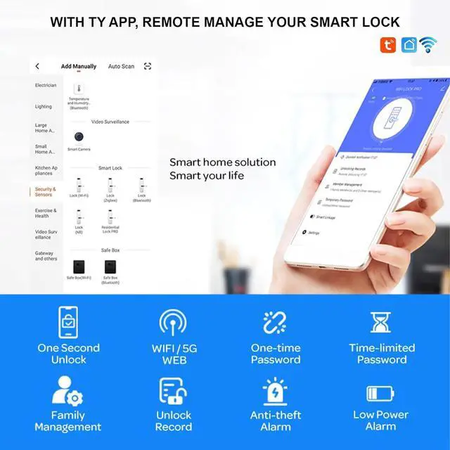 Enhanced Security: The TY WiFi 304 Stainless Steel Smart Door Lock offers 5 unlocking methods - fingerprint, card, password, APP and key - ensuring advanced security for your home. The unique nature of your fingerprint guarantees unparalleled safety, as it utilizes semiconductor technology and biometric features to prevent duplicate fingerprints. Crafted from durable stainless steel, this lock provides reliable protection for your front door.