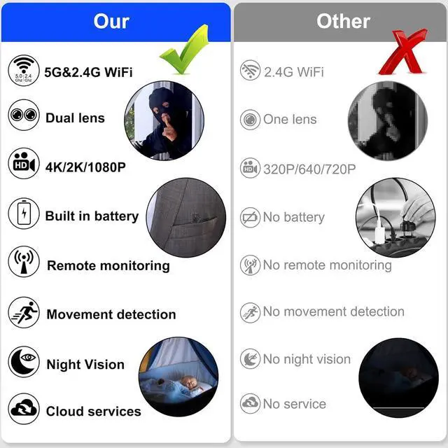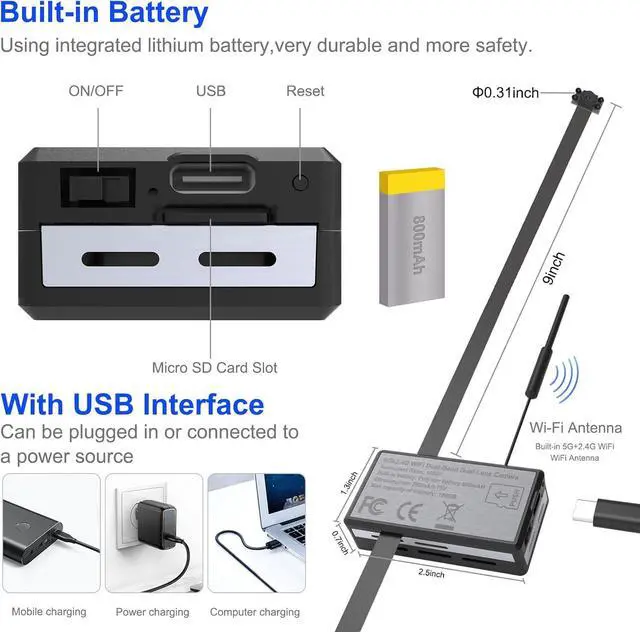 [WiFi Spy Camera Supports both 5G and 2.4G] The core adopts a 5G+2.4G WiFi high-efficiency communication module design, fully compatible with 99.9% of WiFi routers on the market, ensuring stable connections. Coupled with high-speed communication antennas, the signal transmission is stronger, faster, and more stable.
