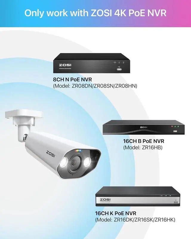 Only Compatible with ZOSI 4K PoE NVRsThis PoE camera is an add-on camera. It cannot be used separately. It needs to connect the Ethernet cable and NVR to work. Only compatible with ZOSI 4K PoE NVR.(Model: ZR16HB,ZR08HN,ZR08SN,ZR16SK,ZR16HK).
