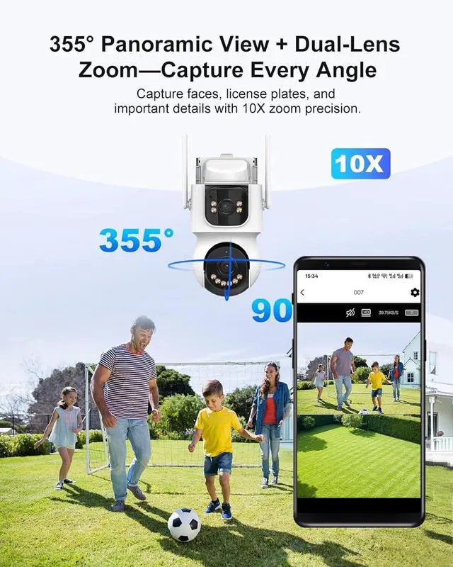 8MP Dual-Lens Clarity with Dual-View Monitoring Combining dual 4MP lenses, this camera offers 8MP high resolution and 10x digital zoom. Monitor two distinct views simultaneously: dual static angles plus PTZ coverage. With 355° horizontal and 90° vertical rotation, it ensures wide-area surveillance with minimal blind spots.