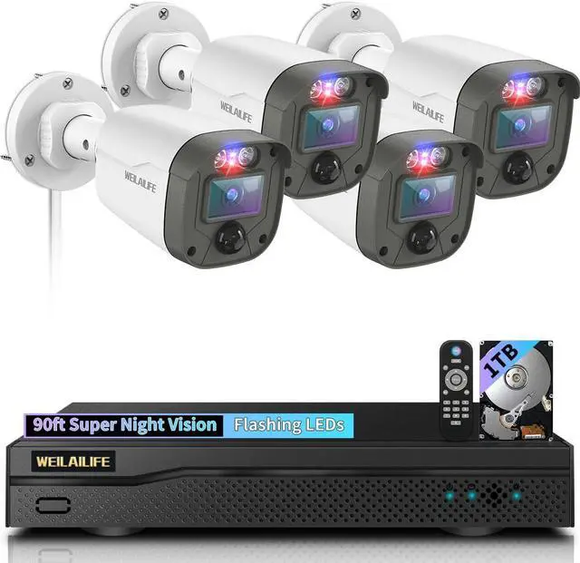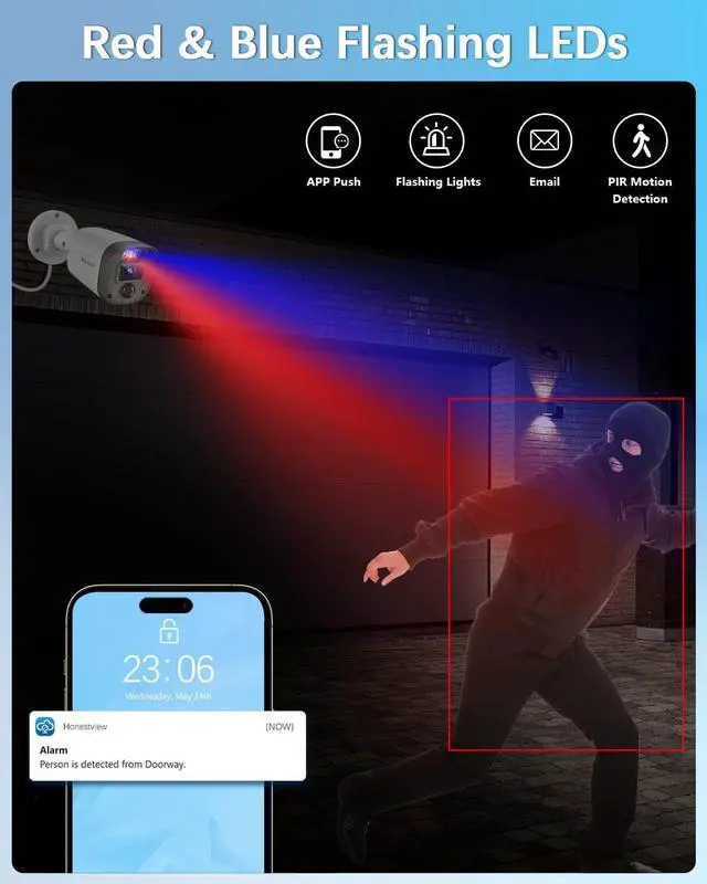 Red & Blue Flashing LEDsThis outdoor wired security camera system features a red and blue strobe light that activates when the PIR sensor detects motion. Whether it's day or night, the red and blue lights will flash for 15 seconds upon sensing any movement, providing a clear visual alert to potential intruders. This added security feature enhances the home security camera system's ability to deter unwanted activity around your property.