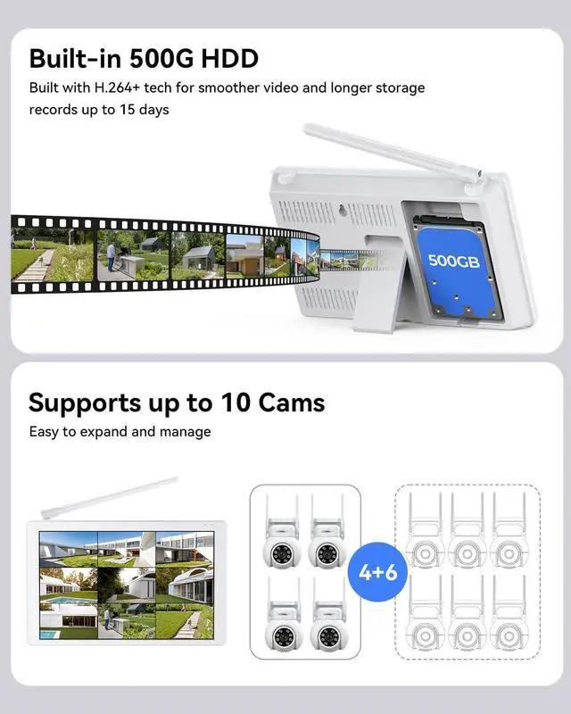 500GB Hard Drive & 24/7 Recording: The system comes with a built-in 500GB hard drive, supporting 24-hour recording. All footage is stored locally on this wireless security camera system, making it easy to review events when needed