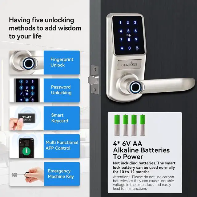 Regarding batteries: Our product does not include batteries and you need to purchase them yourself. The smart lock must use alkaline dry batteries (LR6/LR06) and cannot use carbon batteries. The use of carbon batteries can cause unstable internal voltage in smart locks, which can easily lead to malfunctions. Please pay special attention when purchasing batteries