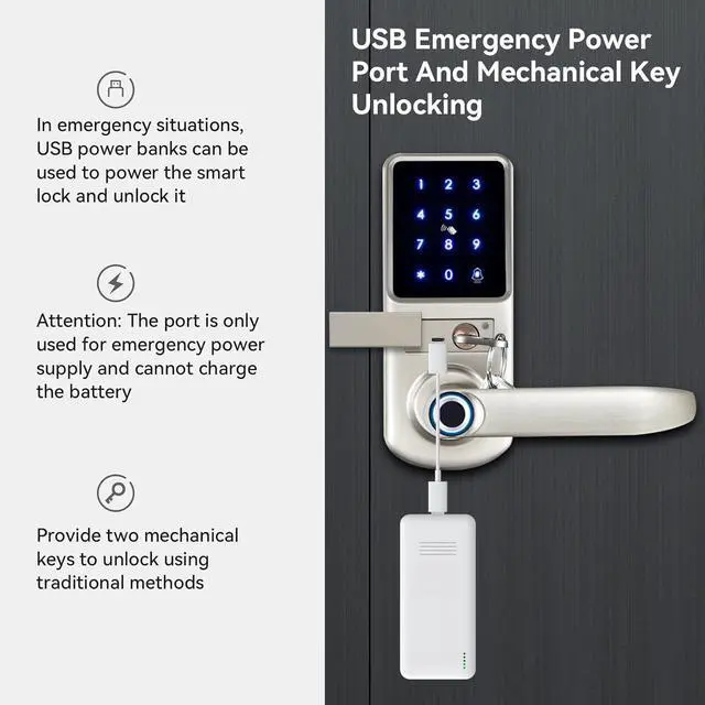 Intelligent recognition and long-lasting battery: This fingerprint password lock can quickly read fingerprints within 0.5 seconds, and the enlarged fingerprint sensor can more easily recognize your fingers. The smart lock can record 50 different fingerprints, and you can authorize your family and friends to use them. The door lock requires 4 No. 5 dry batteries (not included) that can last for 10-12 months and is equipped with a USB port for emergency use (note: this port is not rechargeable)