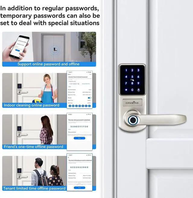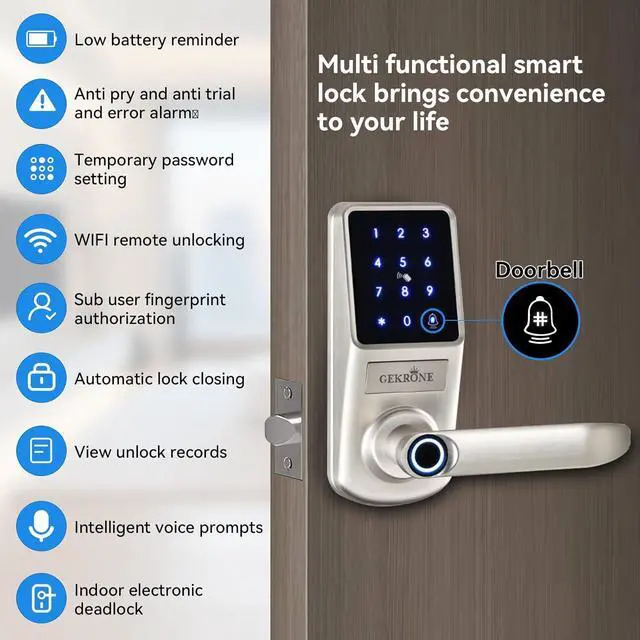 Numerical keyboard door lock management: You can manage access logs, set regular passwords, sub account fingerprint authorization, WIFI remote unlocking, check battery level, lock indoors, doorbell reminders, and also set temporary passwords and send them to friends and visitors for use. If someone tries to pry the lock or fails to unlock it multiple times, the door lock will sound a beep alarm. We are equipped with two mechanical keys, suitable for use by the elderly and children