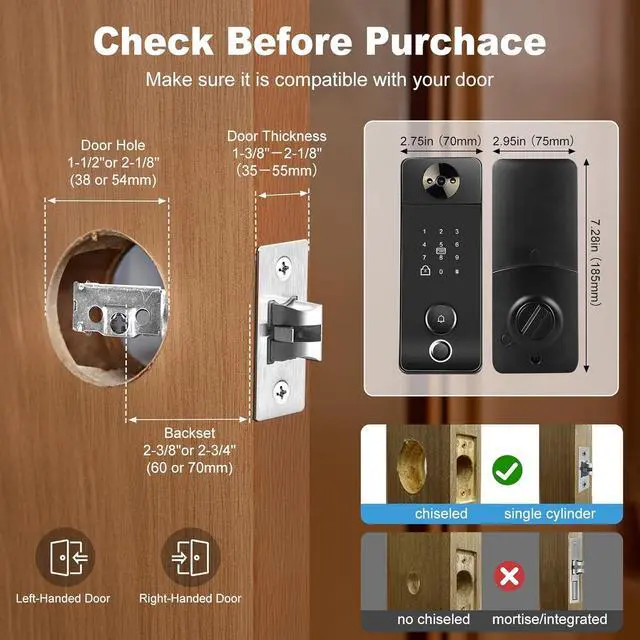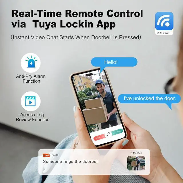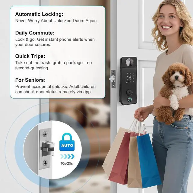 Voice Control, Auto-Lock & Unlock Logs: Connect it to 2.4GHz WiFi to use voice commands with Alexa or Google Assistant (e.g., Unlock the front door or Check lock status) for hands-free convenience. It also auto-locks after the door closes, and you can view unlock video logs or get anti-pry alerts via the Tuya Appno more second-guessing security