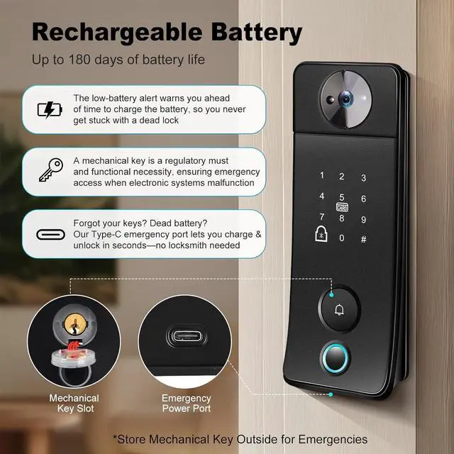 Dual Emergency Solutions - No Lockouts: Even if the lock dies, youre covered: use the Type-C emergency port (power it with a power bank) or the 2 included mechanical keys. Youll never get stuck outside your home again