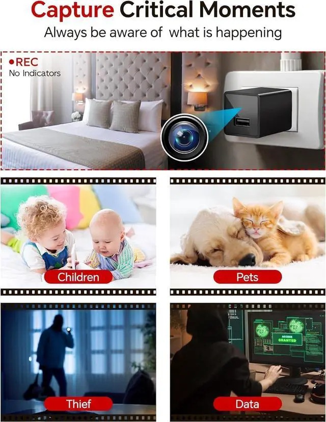 This plug-and-play Full HD 1080P camera requires no internet or Wi-Fisimply connect it to a power source to start working. After recording, use the included USB cable to transfer content directly to your computer, making it extremely user-friendly. Equipped with a 64GB storage card, it allows seamless video recording and playback. Compact and portable, its easy to carry outdoors. Beyond functioning as a camera, This camera can charge your other electronic devices. Its motion detection mode optimizes storage efficiency, conserving space while ensuring reliable home security. A perfect ally for safeguarding your household.