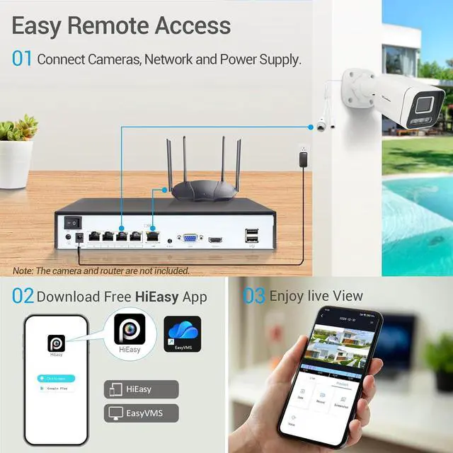 Easy setup and remote accessReceive instant mobile and email alerts when activity is detected. Scan QR Code on NVR from "HiEasy" app for instant live viewing and playback, remotely viewing on desktop on Mac and Windows (Chrome, Edge, Firefox browsers) via the EasyVMS Client, with no contract or monthly fees. Enjoy peace of mind anytime, anywhere.