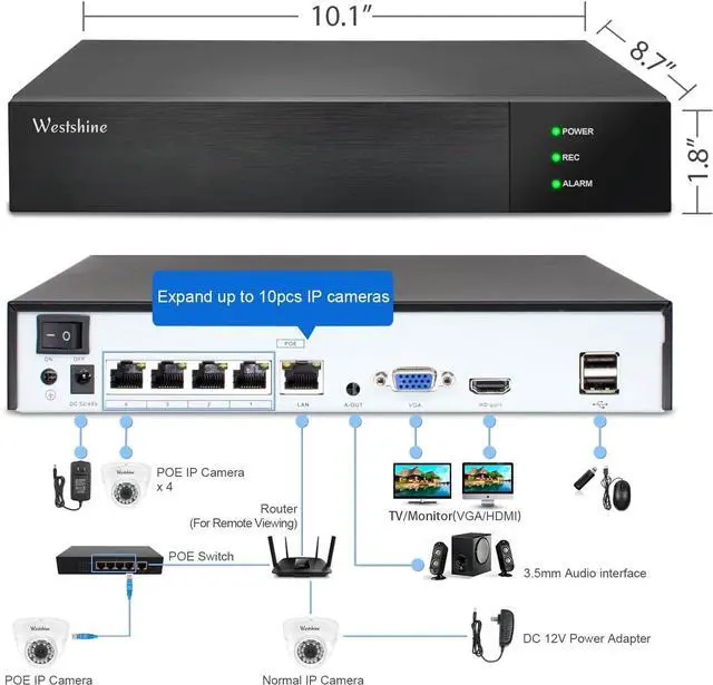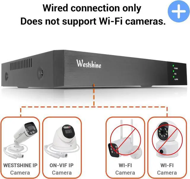 Works with ON-VIF IP CamerasWESTSHINE's 10-channel NVR compatible with most third-party brands 4K/8MP/6MP/5MP/4MP/3MP/1080P Wired IP cameras. PLEASE NOTE: which may have limited motion detection and PTZ support depending on camera manufacturer. Wired connection only, does not support wireless cameras.