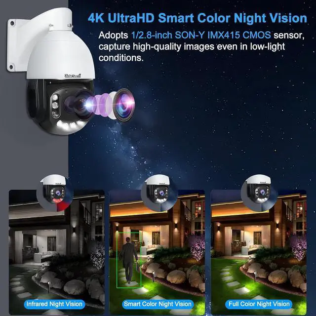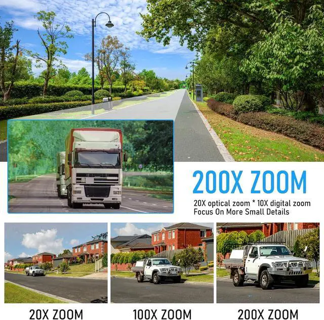 This outdoor ptz poe camera wired delivers 4K 8MP ultra-high-definition imaging, capturing every detail with precision. Equipped with a 1/2.8-inch IMX415 CMOS sensor and a motorized zoom lens (4.7-84.6mm), it achieves 20x optical zoom and 10x digital zoom without compromising image quality. It supports remote viewing of vehicle license plates, making it ideal for large-scale locations such as parking lots, supermarkets, gardens, and roadside areas.