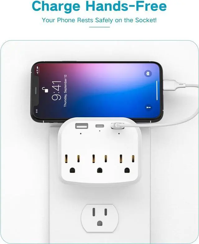 3-in-1 Smart Socket - Ultimate convenience: 2x 3.4A USB ports, 1 Type-C port, 3 AC outlets, plus a built-in phone/tablet stand for charging & easy viewing.