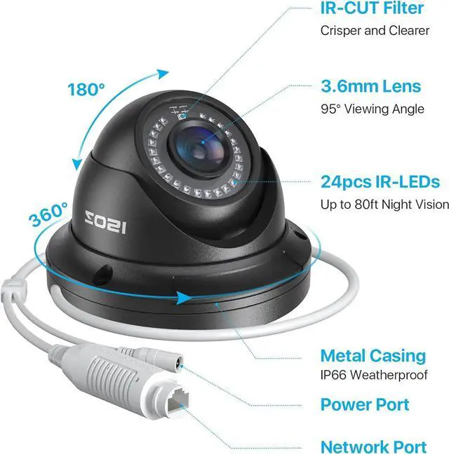 (2). [ 5MP HD Clarity & 80ft Night Vision ]__ Equipped with a 1/2.65" CMOS sensor and 24 infrared LEDs, this camera captures crisp 3K (2880×1620) footage with true-to-life colors during the day and clear black-and-white images at night. Night vision distance up to 80ft ensures around-the-clock protection. With a 4.0mm fixed lens offering a wide coverage of approximately 95° viewing angle, depending on the environment it is being used in.