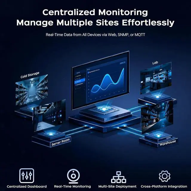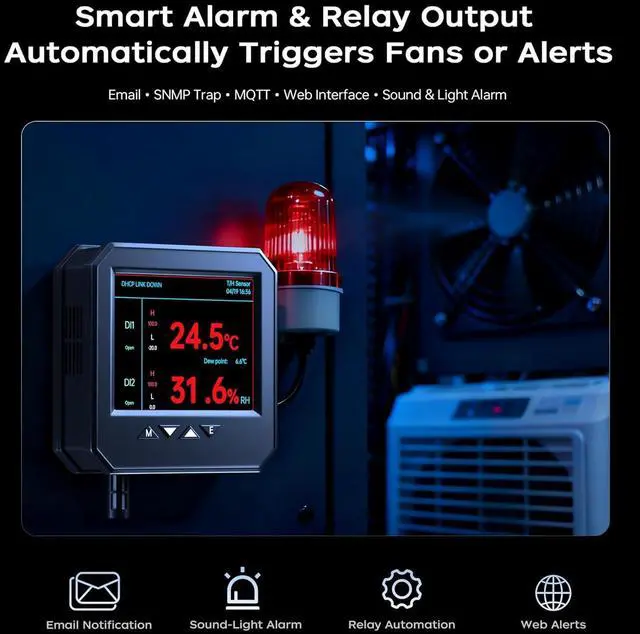 Multi-Channel Smart Alerts & Automated Response: Stay protected from sudden changes with multi-channel notifications. The APEM-5930 supports email alerts via SMTP, SNMP trap, and MQTT messages, as well as visual and audible alarms. Use the onboard relay output to automatically activate fans, AC units, dehumidifiers, or warning lights enabling true automated environmental control for your server room or warehouse.