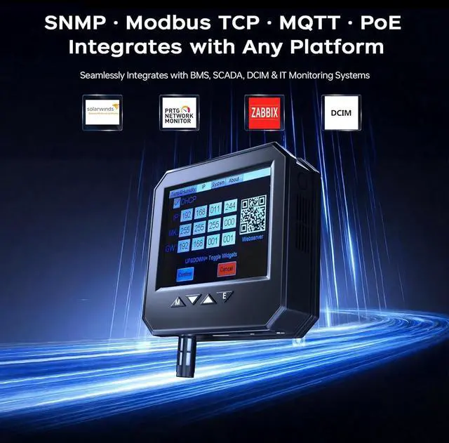 Powerful Network Integration & Open Protocols: Engineered for seamless system compatibility, this PoE environmental sensor supports Ethernet 10/100M, Modbus TCP, SNMP v1/v2, UDP, MQTT, DHCP, and RS-485 to Ethernet bridging. It easily connects with BMS, SCADA, DCIM, or custom IoT dashboards for centralized visibility. View and adjust MAC address, IP, and protocol settings directly from its browser-based interface.