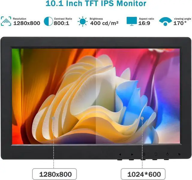 10.1" TFT IPS MonitorOSCY 10.1 inch LED security computer monitor with HD 1280*800 resolution, 60HZ, 800:1 dynamic contrast ratio, 400 cd/m2 brightness, 16:9 aspect ratio and 170° wide viewing angle, bright saturated images and high colour reproduction will bring you pleasant visual enjoyment.