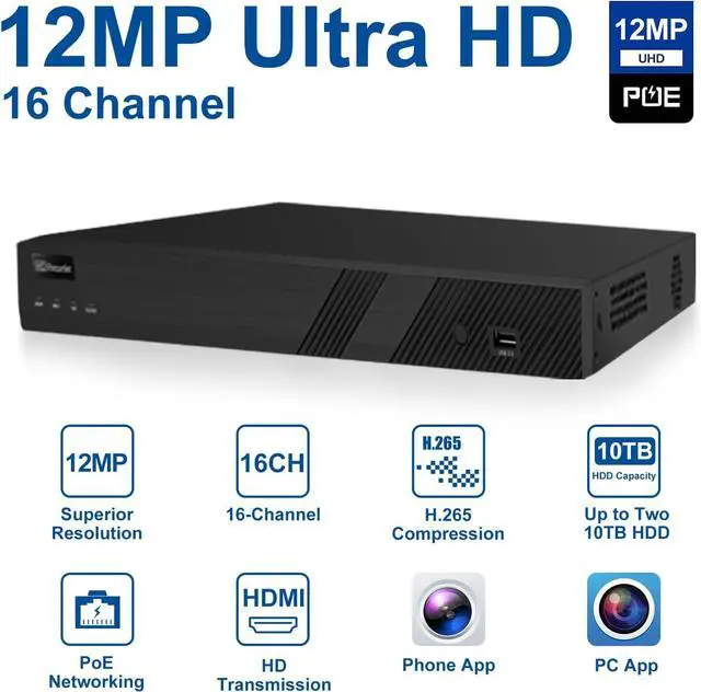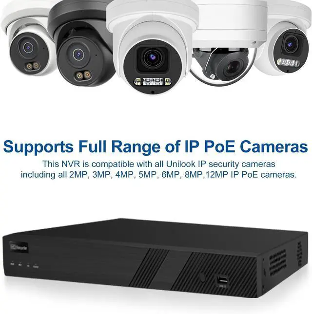 16 Channel NVR and 12MP Ultra HD Resolution: This 16 channel Unilook NVR network video recorder, supports Simultaneously connect 16pcs of surveillance cameras recording with a resolution of up to 12MP/6K. NVR support 12MP/8MP/6MP/5MP/4MP/3MP/ 1080P PoE IP camera. Note: This 6K NVR supports 4K TV or monitor HDMI or VGA interface connection and output.
