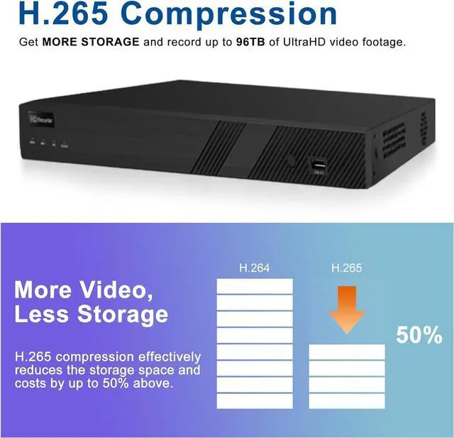 H.265/H.264 Compression Technology: 16CH PoE NVR supports H.265/H.264 compression technology. Compared with H.264 compression, H.265 compression effectively reduces storage space by up to 50%, compresses recorded video files and reduces the use of hard disks. The NVR supports up to two 10TB hard disks (excluding hard disks).