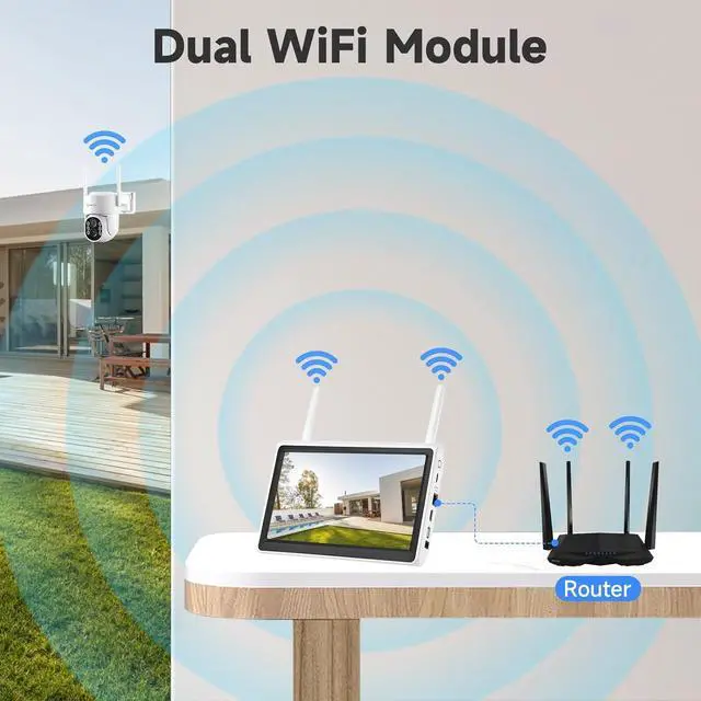 Dual WiFi - The NVR built-in monitor has two wifi modules, one for connecting cameras wirelessly and the other for connecting it to the internet for remote access. Therefore all your cameras connects to the monitor wirelessly, no cables needed; and you can connect the monitor to the router via WiFi, no need to hardwire them.