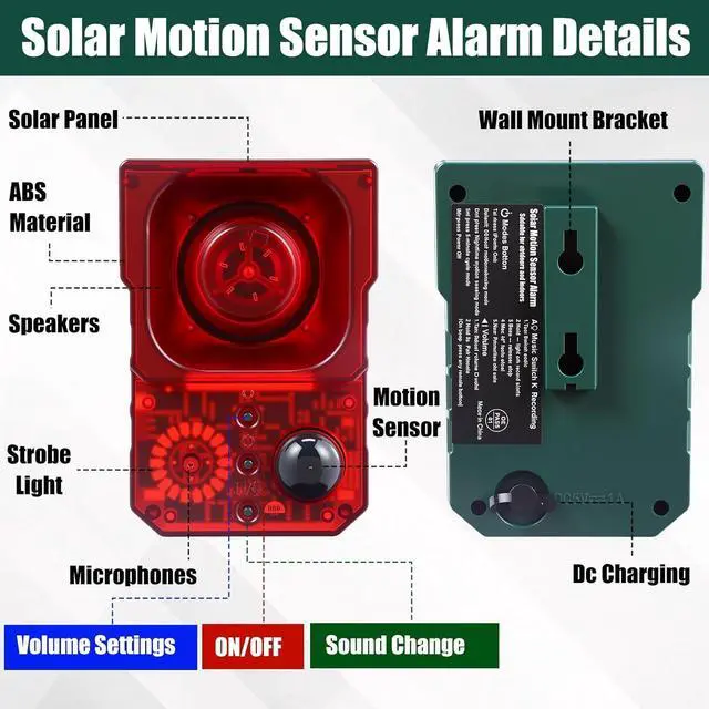 Easy Remote Control: easy operation with our barking dog motion sensor: a: 24-hour motion sensor flash and alarm(first press); Night motion sensor flash and alarm(second press); 24-hour flash and alarm mode every 5 minutes(third press); B: change the audio played; C: 3 volume levels can be adjusted; D: turn off; The solar motion alarm is ideal for deterring