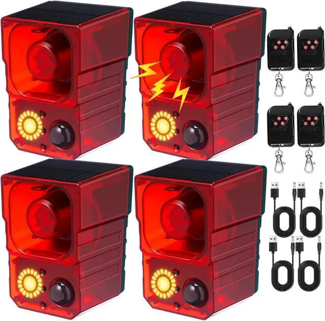 Complete Coverage: you will receive 4 set motion sensor noise maker with USB charging cable, wireless remote control, manual and accessories complete (Note: remote controls can only be shared within the same package); Enough solar motion alarms provide layered protection for larger areas
