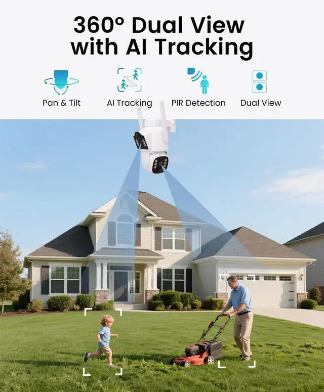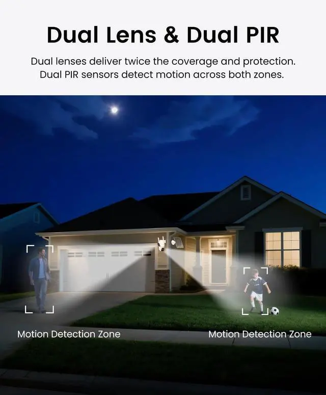[Dual Lens = Two Cameras in One] Features a fixed top lens and a pan-tilt bottom lens, each with its own view in the app. Monitor two separate areas with one device-perfect for frontyard+driveway, porch + backyard, and more.